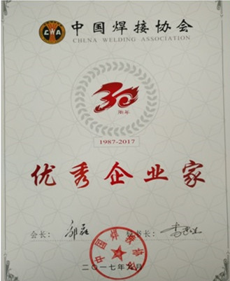 翟總獲得“中國焊接行業(yè)優(yōu)秀企業(yè)家”榮譽